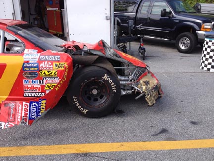 Car #69 had a right front tire problem that resulted in this damage.