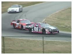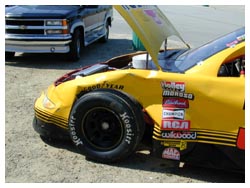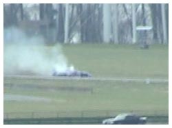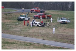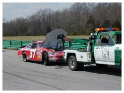 Mark Furcini being towed in and a shot of Scott Murphy's car after spinning out at the Oak tree and hitting a tire wall.
